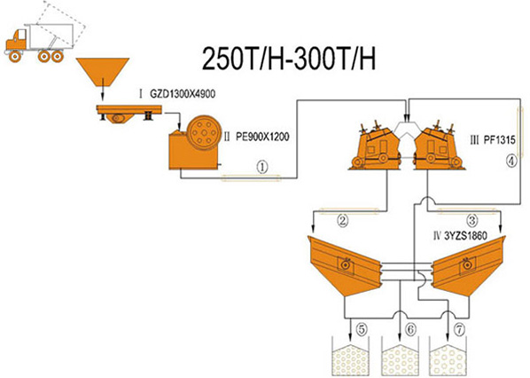 Линия для производства каменных материалов включает в себя вибропитатель GZD1300*900,щековую дробилку PE900*1200,роторную дробилку PF1315,вибросито 3YZS1860,ленточный конвейер B1200*21M и централизованную электрическую систему управления и др.Проектная производительность производства составляет от 40т/ч до 600т/ч. Для удовлетворения конкретных требований клиента для дробления каменных материалов, мы можем также добавить другие оборудования, такие как конусная дробилка, пылеуловитель в дробильную установку.